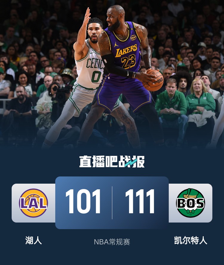 比赛开局双方便剑拔弩张展开对攻架势,湖人反客为主以一波7-0抢占先机,绿军开局打得稍显被动,但他们节中5个回合全部打成且命中4记三分的炮火也让湖人喝上一壶;双方之后进入长时间的拉锯交替拿分互不相让,绿军方面双探花半场合砍36分,湖人则以詹姆斯贡献14+8+7的准三双为核心做出应对,最后时刻塔图姆一内一外拿下5分帮助绿军取得4分优势进入下半场。休息归来湖人开局莫名哑火6分在里仅靠东契奇罚球拿到2分,绿军这边轰出一波19-2的攻势直接拉开21分的巨大优势;不过末节湖人突然找到感觉轰出一波18-5的攻势并在节中追至4分看到希望,不过期间詹姆斯的受伤离场让湖人很受打击,而绿军依靠布朗和塔图姆的连续拿分重新拉开10分领先稳住局面。最终,凯尔特人主场击败湖人,并终结湖人8连胜。