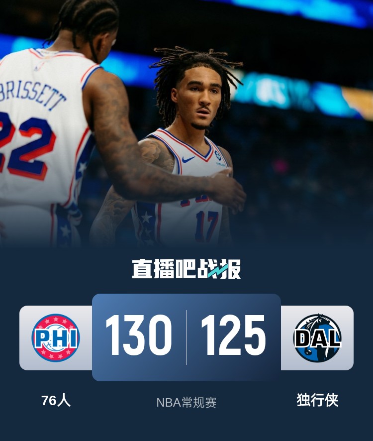 此役一上来格莱姆斯联手亚布塞莱不断取分,席菲诺替补登场连中三分,华盛顿连造杀伤单节14分及时止血,首节结束时76人领先4分,次节回来,独行侠众将找到进攻感觉,多点开花的他们一举反超,半场战罢,独行侠后来居上领先4分。易边再战后双方你来我往火热对攻,格莱姆斯延续火力予取予求,三节结束后76人反超确立12分优势,末节上来,丁威迪联手克莱率队追分,决胜时刻丁威迪仓促绝平未果,76人连中罚球后独行侠回天乏术,最终76人130-125力克对手。