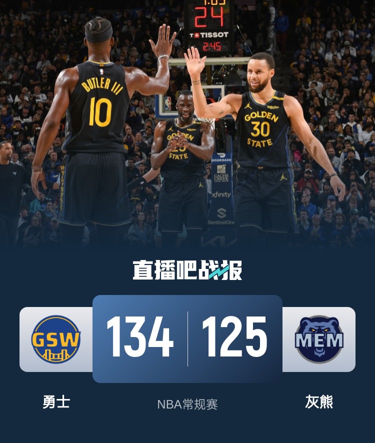 首节之争库里早早进入状态手感热的发烫,他在第一节8投7中,其中三分球6投5中爆砍19+5+4的全面数据,勇士也在他的带领下轰出单节45分的攻势,他的暴走也让灰熊首节32分的发挥黯然失色且首节就落后13分;次节库里让人保持着火热手感再中三记三分砍下13分,不过灰熊虽然守不住但进攻端保持不错发挥,半场4人得分上双帮助他们追至8分进入下半场。休息归来库里延续手感第三节再度砍下13分3助攻3抢断,但灰熊以莫兰特为首攻势起来多点开花并在第三节抹平比分;末节灰熊一鼓作气一度实现反超,不过最后时刻库里命中关键三分夺回领先,随后巴特勒连续强硬制造犯规命中罚球,勇士最后时刻送上一波12-2的攻势重新拉开比分锁定胜局。最终,勇士力克灰熊,排名上反超灰熊升至西部第五。
