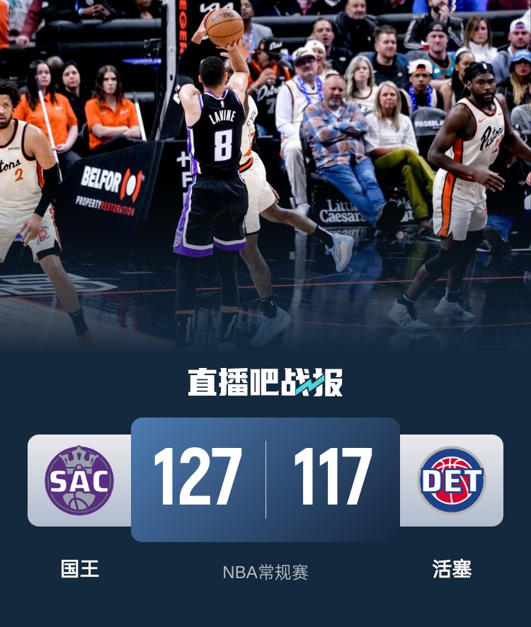 上半场,双方势均力敌,比分交替领先,活塞冲击篮筐频频得手取得领先,国王多点开花迅速回应,双方大打对攻,次节国王命中率下降,活塞内外开花将分差拉开到两位数,半场战罢活塞72-62领先国王。下半场,活塞抢得先机继续扩大领先,但德罗赞连投带罚止住颓势,拉文里突外投带队反超,末节拉文手感滚烫再轰4记三分,德罗赞招牌中投连续拿分带队将分差拉开到两位数,活塞苦苦追赶无果。最终,国王127-117力克活塞,客场过关。