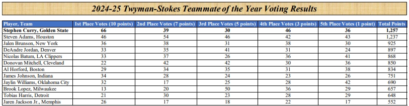 库里在最终的投票中,以20分的优势力压亚当斯,获得该奖项。