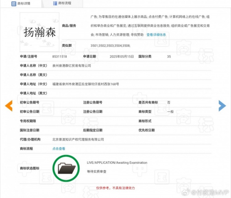 7月23日讯 媒体人付政浩发博,谈到了杨瀚森姓名商标被抢注的现象。