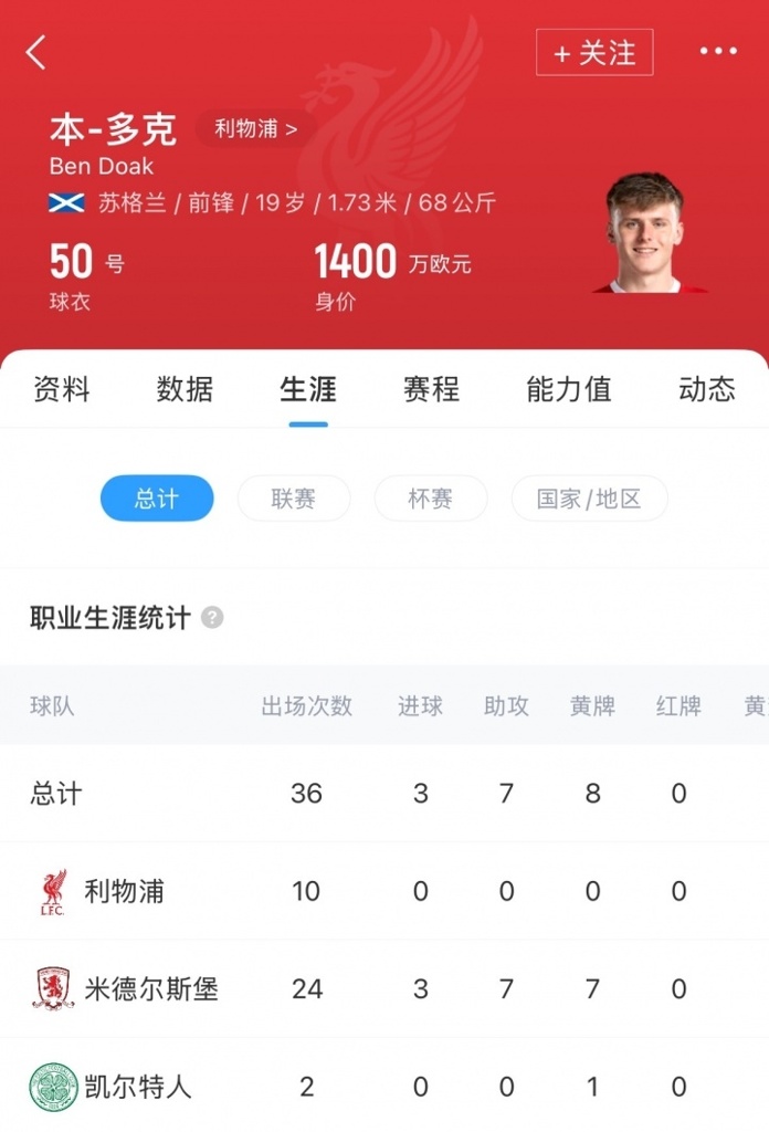 本-多克现年19岁,上赛季被利物浦外租至英冠球队米德尔斯堡,出场24次贡献3球7助,目前他的德转身价为1400万欧元。