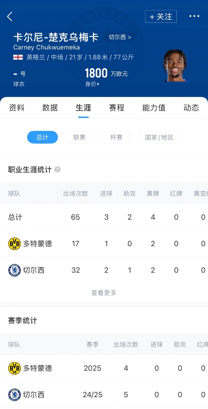 楚克乌梅卡现年21岁,英格兰中场,切尔西在2022年花费1800万欧元将其从维拉签下。上赛季冬窗他被租借至多特蒙德,球员代表多特出场17次,贡献1球。目前楚克乌梅卡德转身价为1800万欧。