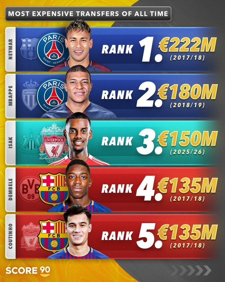 9月2日讯 利物浦签下25岁纽卡前锋伊萨克,球员转会费1.3亿英镑(1.5亿欧),足坛最贵转会的排行榜也出现了变动!