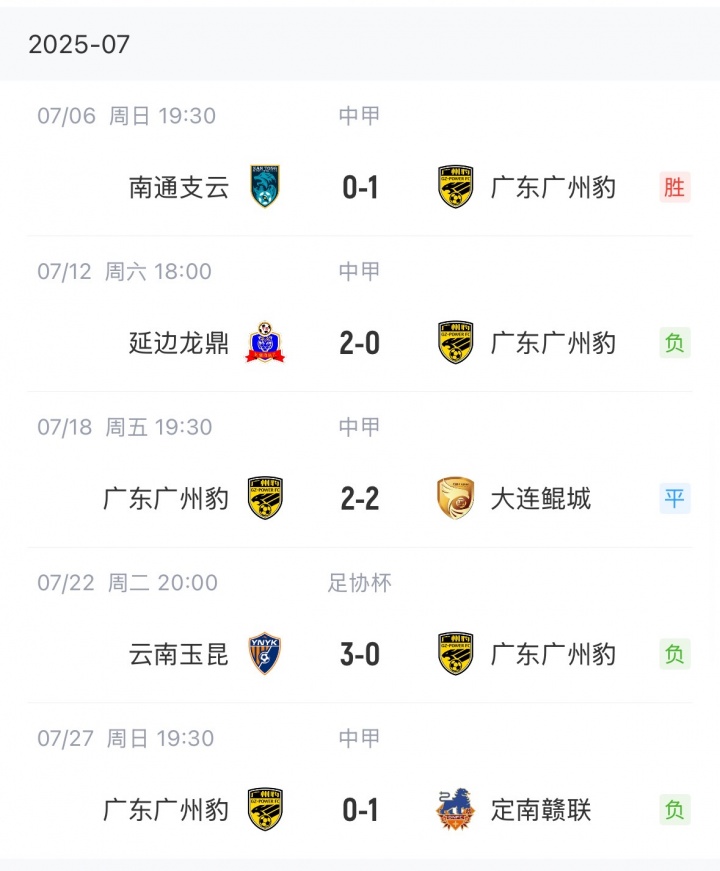 广州豹近4场比赛输掉3场,目前球队落后第二的铜梁龙10分之多。