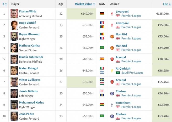 今夏球员转会费排行(单位:欧元/数据来源:德转/未激活浮动不计入):