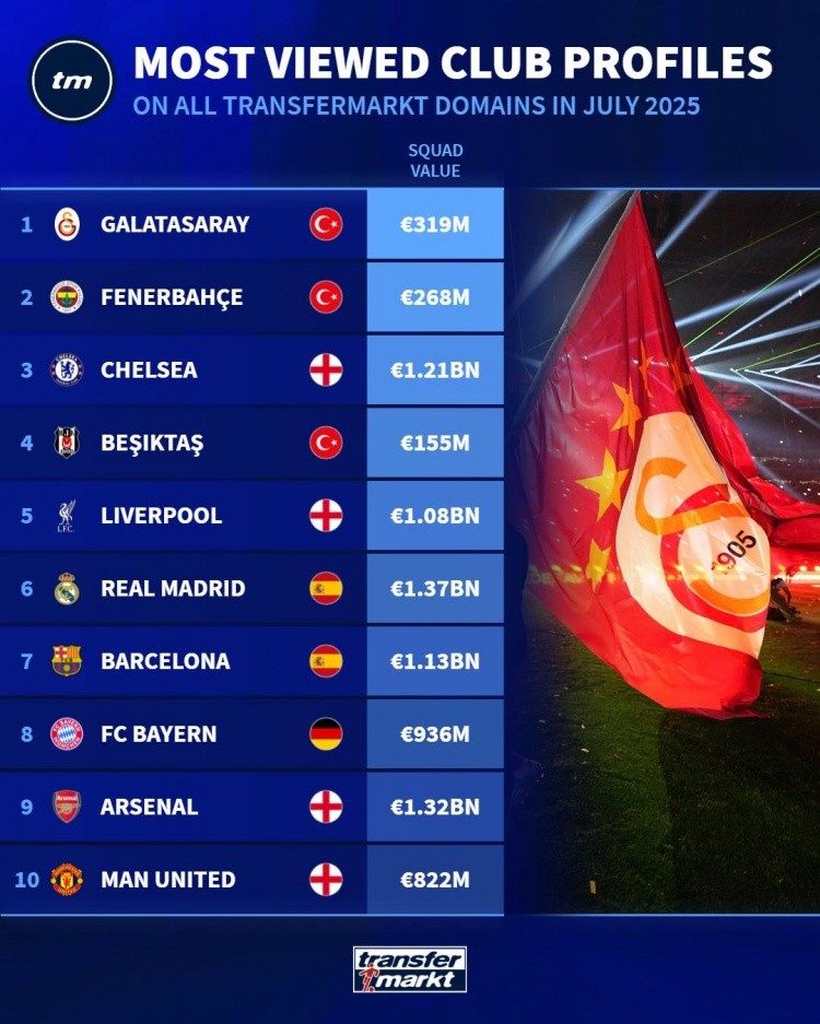 8月3日讯 德国转会市场统计了球员、俱乐部资料7月份的浏览量,并列出榜单,球员方面奥斯梅恩居首,俱乐部方面加拉塔萨雷夺魁。